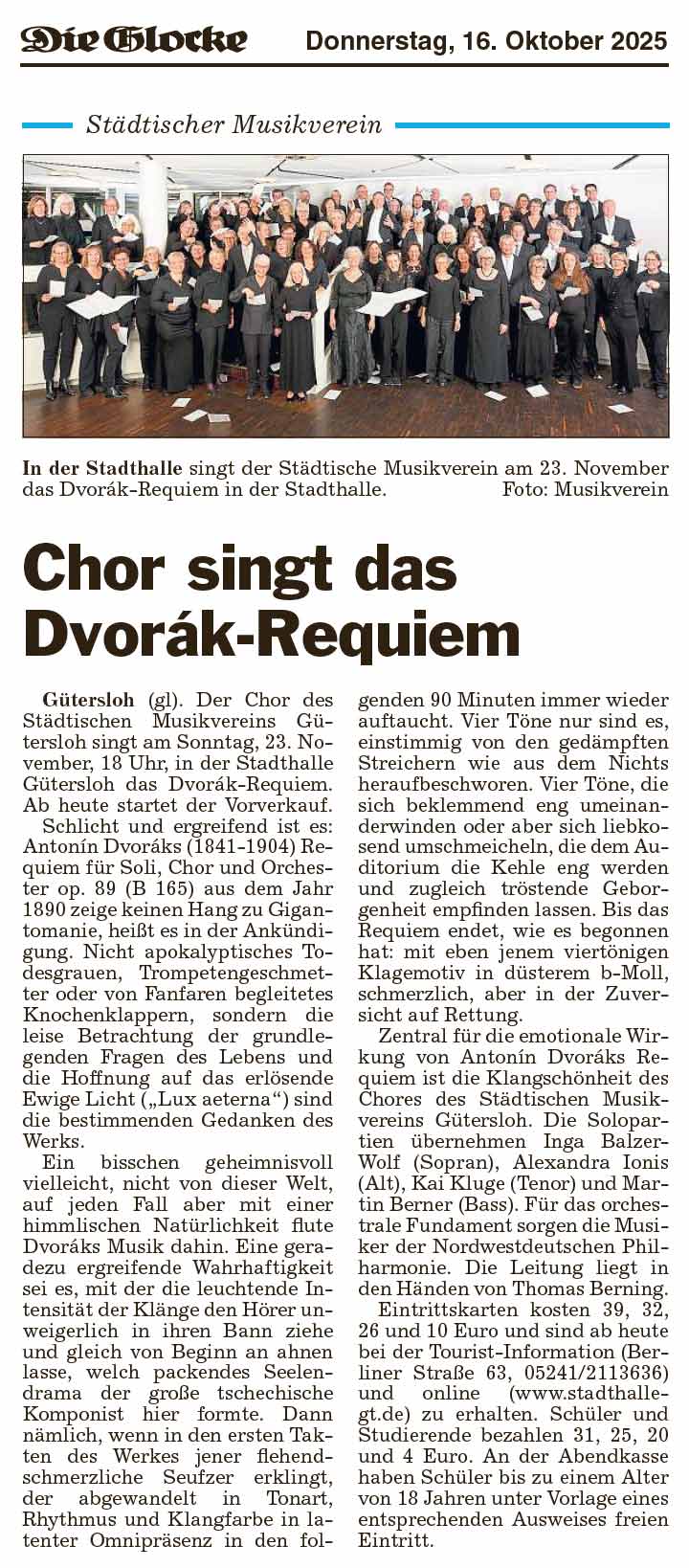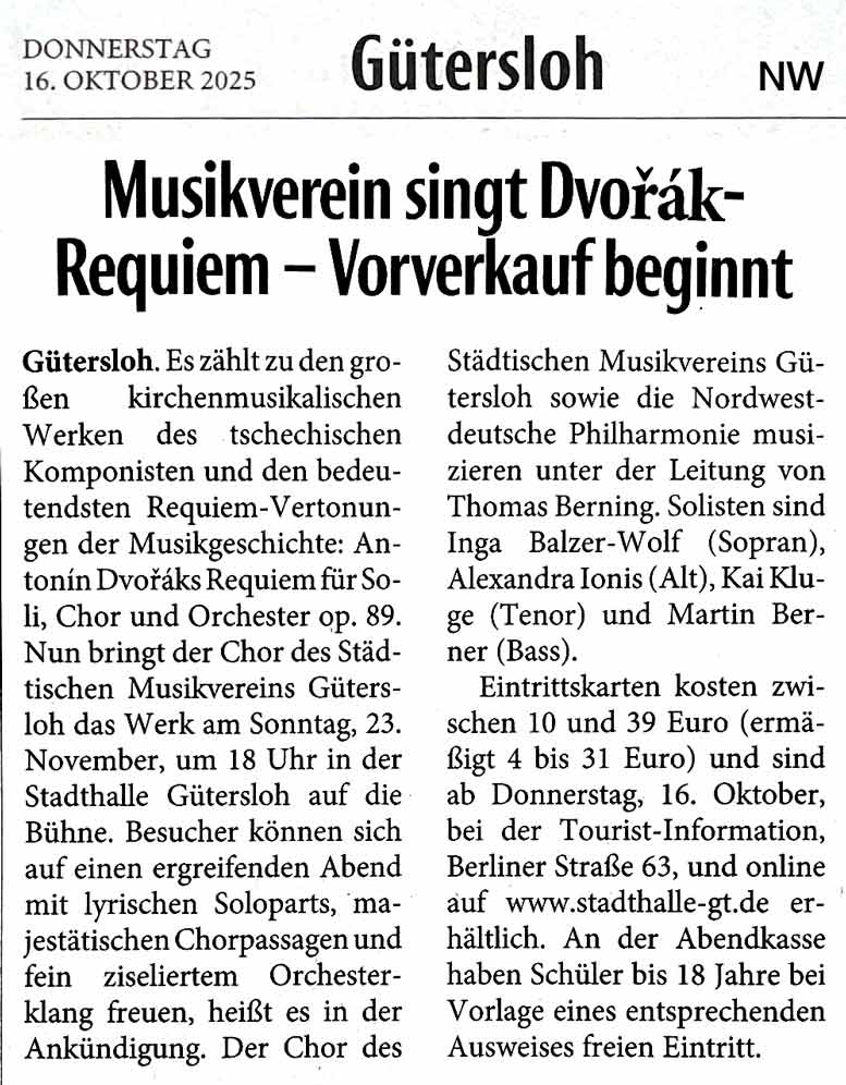Dvořáks Requiem zählt zu den großen kirchenmusikalischen Werken des tschechischen Komponisten und den bedeutendsten Requiem-Vertonungen der Musikgeschichte: Antonín Dvořáks Requiem für Soli, Chor und Orchester op. 89. Besucher können sich auf einen ergreifenden Abend mit lyrischen Soloparts, majestätischen Chorpassagen und fein ziseliertem Orchesterklang freuen.